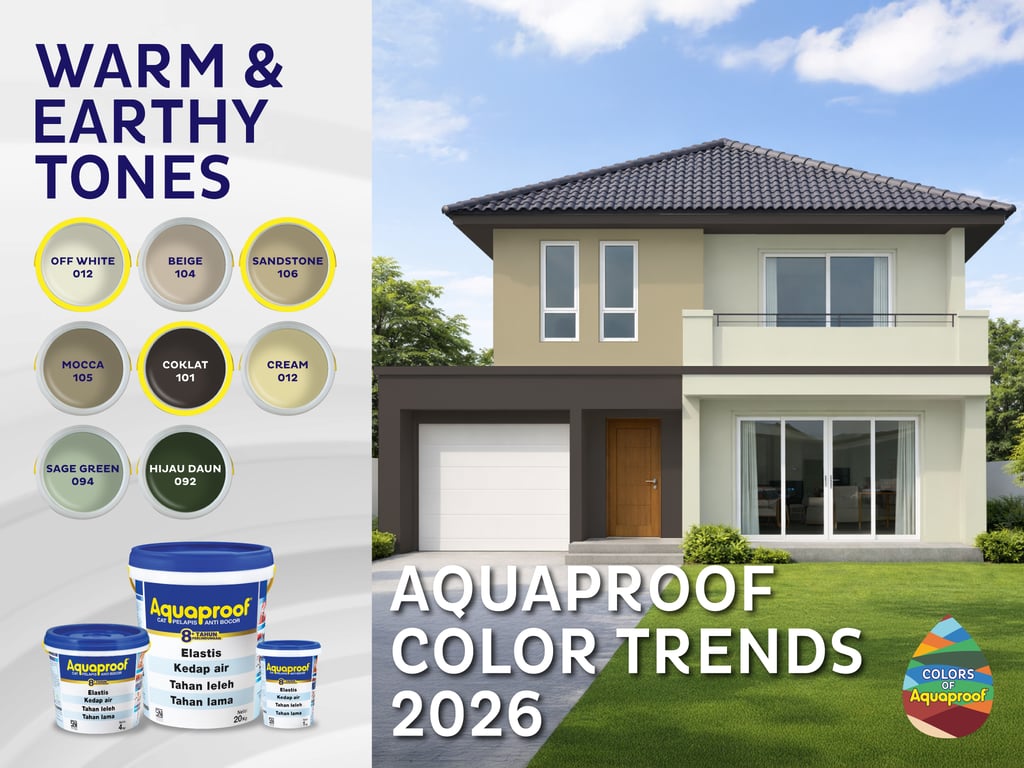 Aquaproof pelopor cat pelapis anti bocor di Indonesia mengusung 8 warna, hangatnya Warm & Earthy Tones sebagai tren cat dinding luar 2026